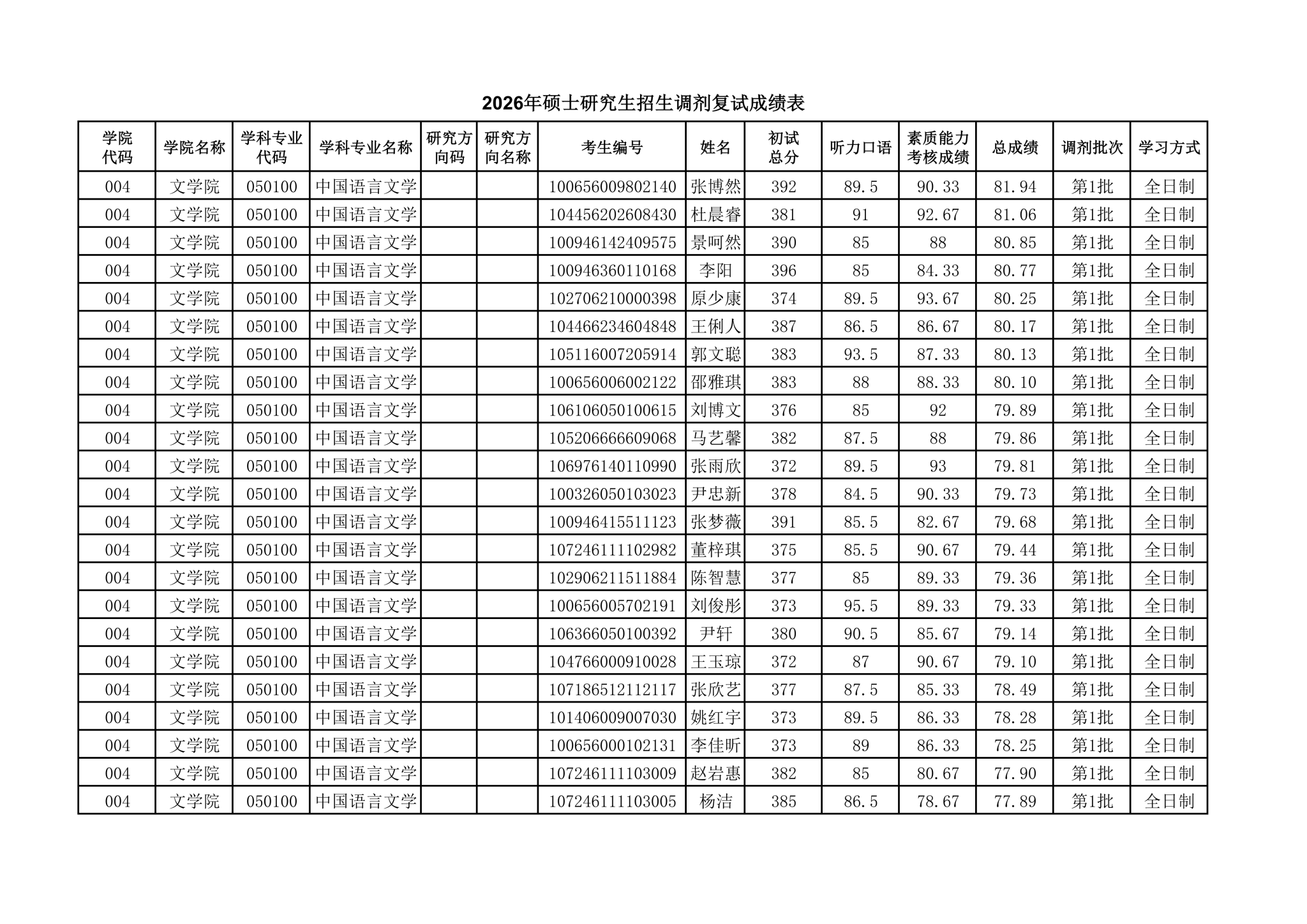 根据教育部有关文件规定,经学校研究生招生工作委员会审批,现将六合彩网站 中国语言文学2026年硕士研究生调剂考生复试成绩进行公示。