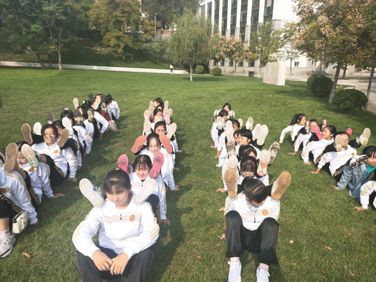 心理部在活动前期做出了精心的策划,并积极筹备活动,使活动得以顺利开展。在活动中,每个班级依次用动听的班歌展现了团体的风貌,班徽、宣言与口号也充分地展现了班级的风采,其中,一班演唱的《我们都是追梦人》这首歌感情充沛,赢得了阵阵掌声。活动将同学们划分为八个小组,分别参加了“链接加速” “千足虫” “穿越雷区”“人椅”这四种游戏,并进行友谊竞赛。草地上,同学们凭借手臂,相互支撑着前行,紧咬着牙齿,一直坚持到最后;“雷区”前,蒙着眼的选手听着队友的指挥,旁边的加油声一浪高过一浪,飘荡在上空;宽阔的平地上,同学们围成一个圈,紧紧搂着前方同学的腰,稳稳坐下,大家的友好协作让活动更添了一分温馨;树木下,只听一声号令,选手们跳跃着奔向终点,眼底满是兴奋。一幕幕都成为了无可替代的风景画卷。