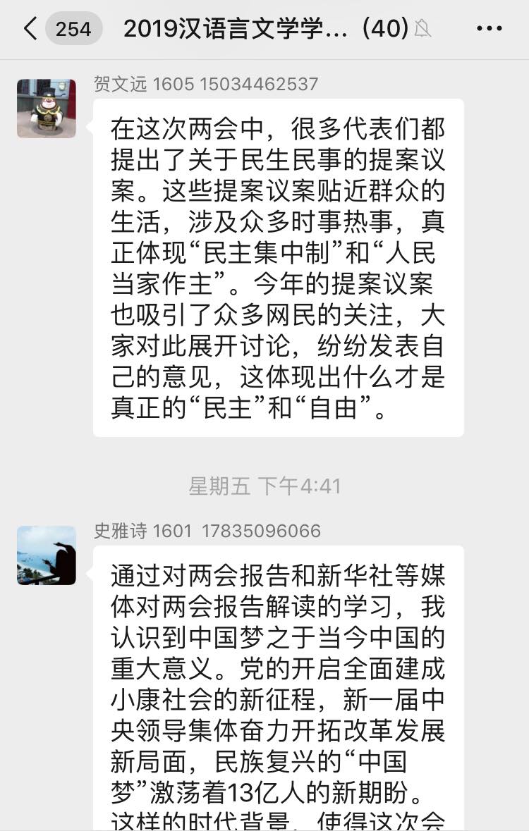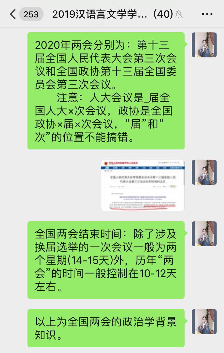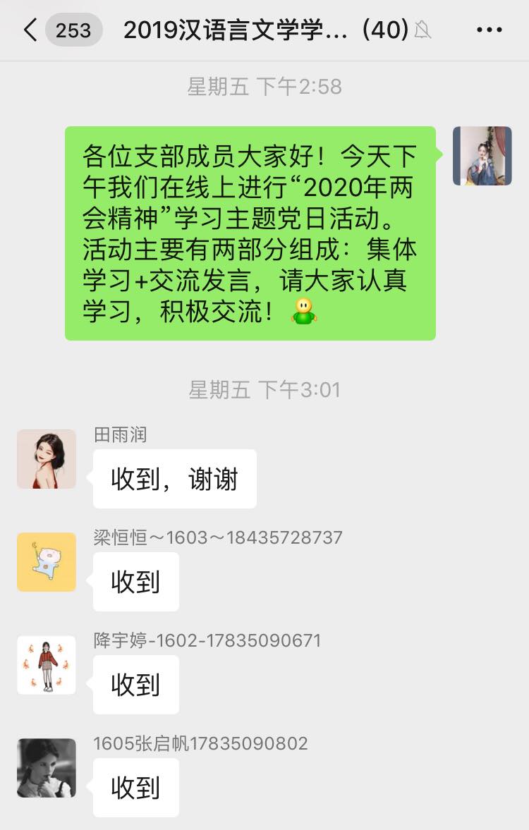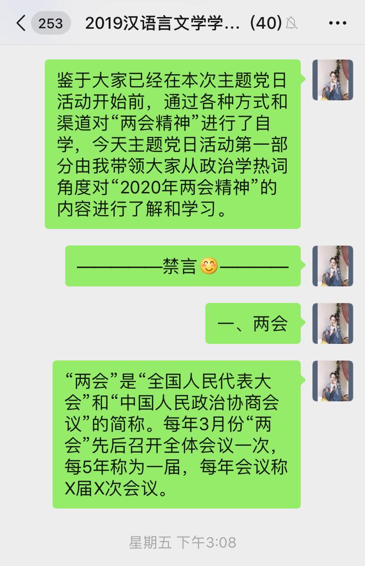 汉语言文学学生党支部开展学习“2020年两会精神”线上专题党日活动,支部全体党员参加本次会议,会议由支部书记侯昕昊主持。