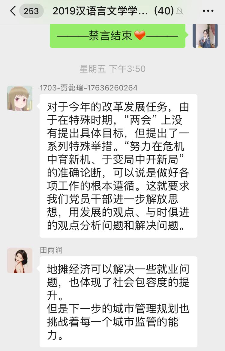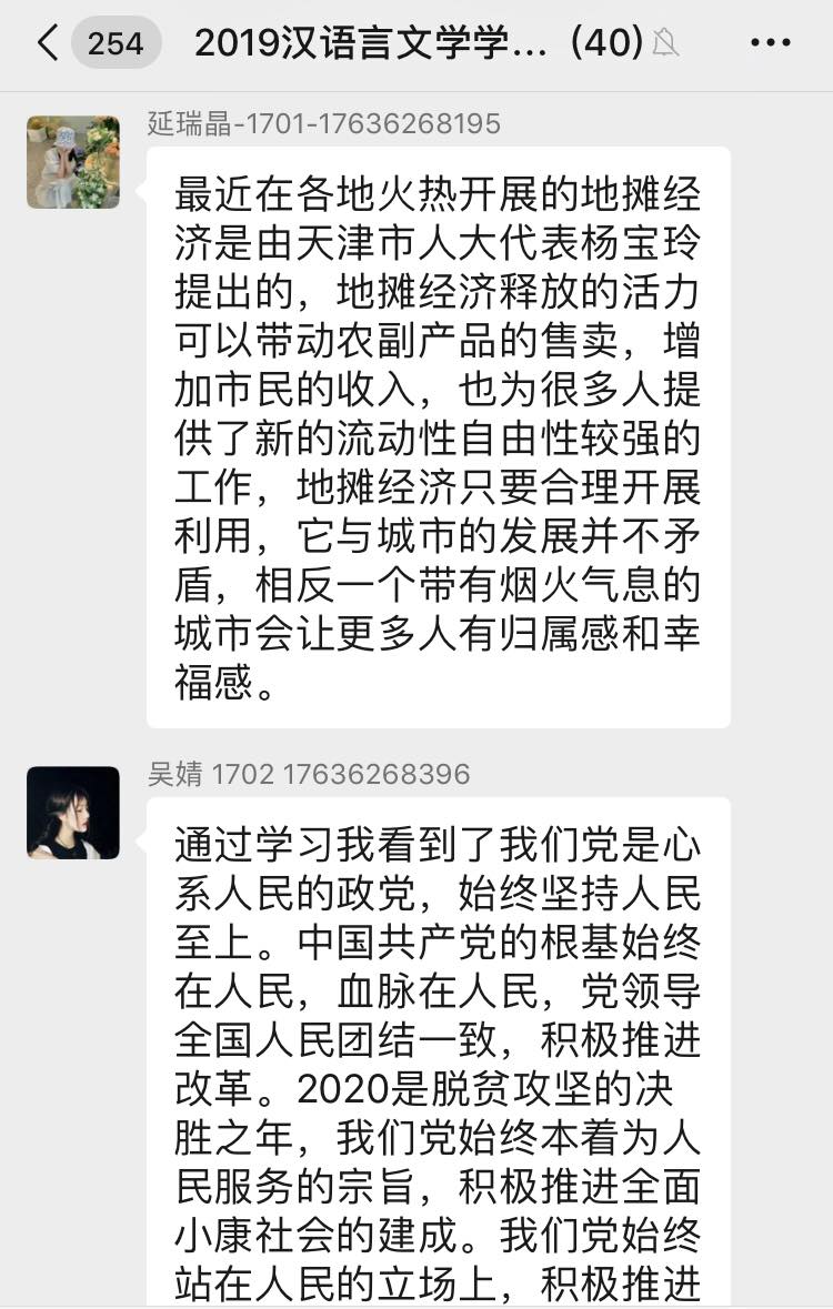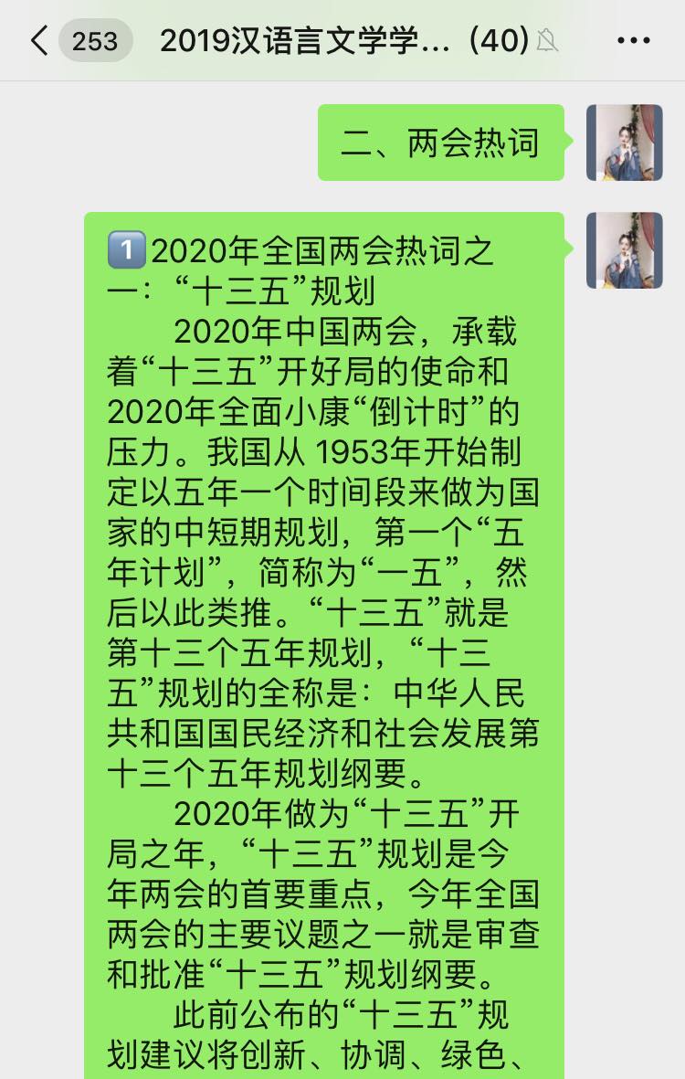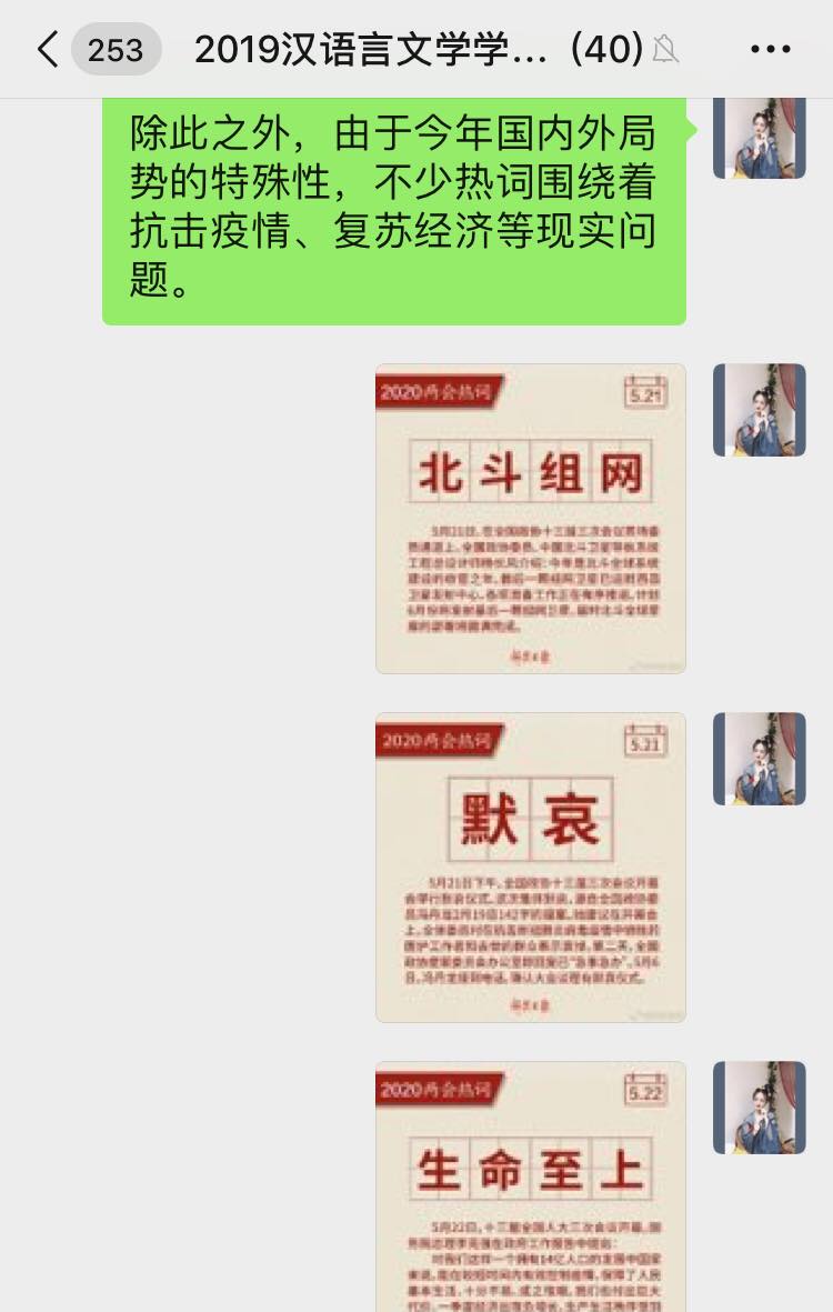 汉语言文学学生党支部开展学习“2020年两会精神”线上专题党日活动,支部全体党员参加本次会议,会议由支部书记侯昕昊主持。